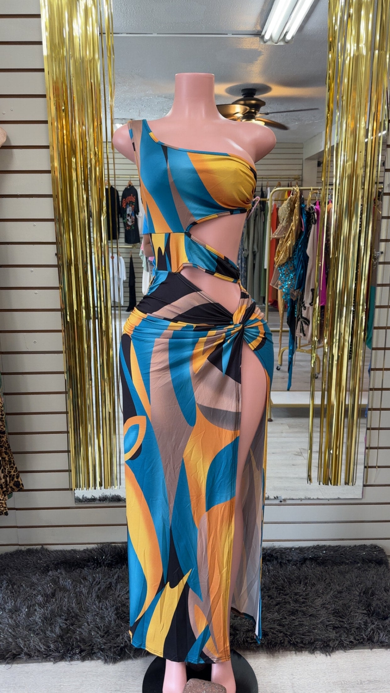Turn heads in this vibrant one-shoulder cutout maxi Dress, featuring a bold abstract print in blue, yellow, and orange hues. With a high side slit and wrap skirt detail, this outfit is perfect for beach days or summer nights out.